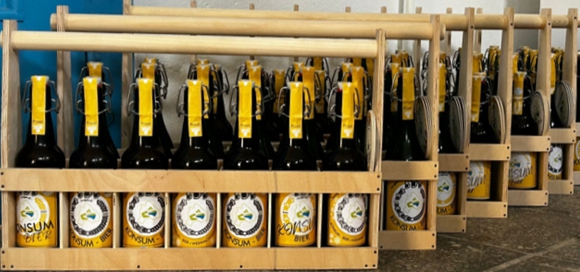 7 Flaschen KONSUM-Bier® in der paraktischen Tragetasche aus Holz.